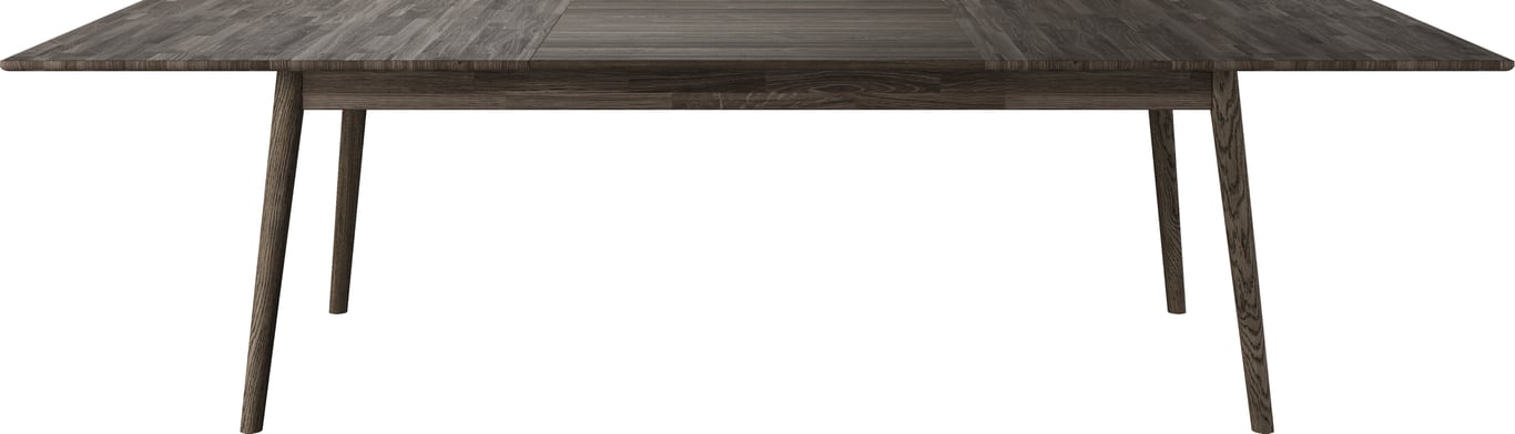 SM25 Spisebord, moccafarget lakkert eikefiner, inkludert 3 tilleggsplater. Det unike, patenterte ekspansjonssystemet er enkelt og lett å bruke, selv for en enkelt person. Bordets fire ben deler seg i åtte når bordet forlenges, noe som gir god støtte og stabilitet i hele bordplatens lengde. Bordet når sitt fulle potensial på opptil 20 personer når det utvides med alle seks mulige tilleggsplater. Tre av tilleggsplatene følger med og kan enkelt og bekvemt oppbevares i magasinet under bordet.